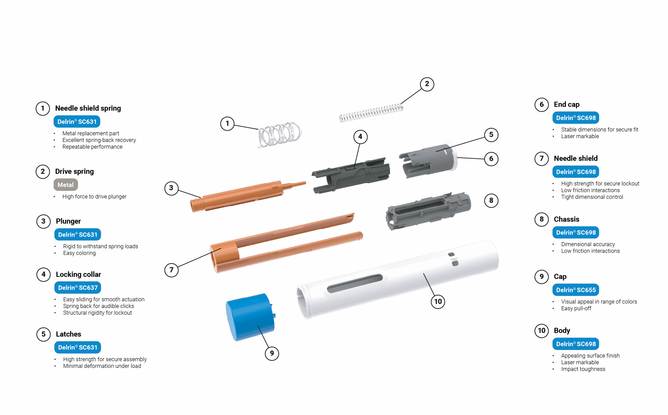 Delrin 4D™ is a concept device with all plastic parts made entirely from Delrin®. Combining the superior performance attributes of Delrin® and the numerous benefits of a mono-material device approach, such as design and manufacturing simplification and enabling disassembly, reusability and circularity options. Delrin 4D™ can be incorporated into next-generation drug delivery devices to address sustainability challenges, while maximizing productivity, simplifying logistics, de-risking supply chains and ensuring regulatory compliance.
